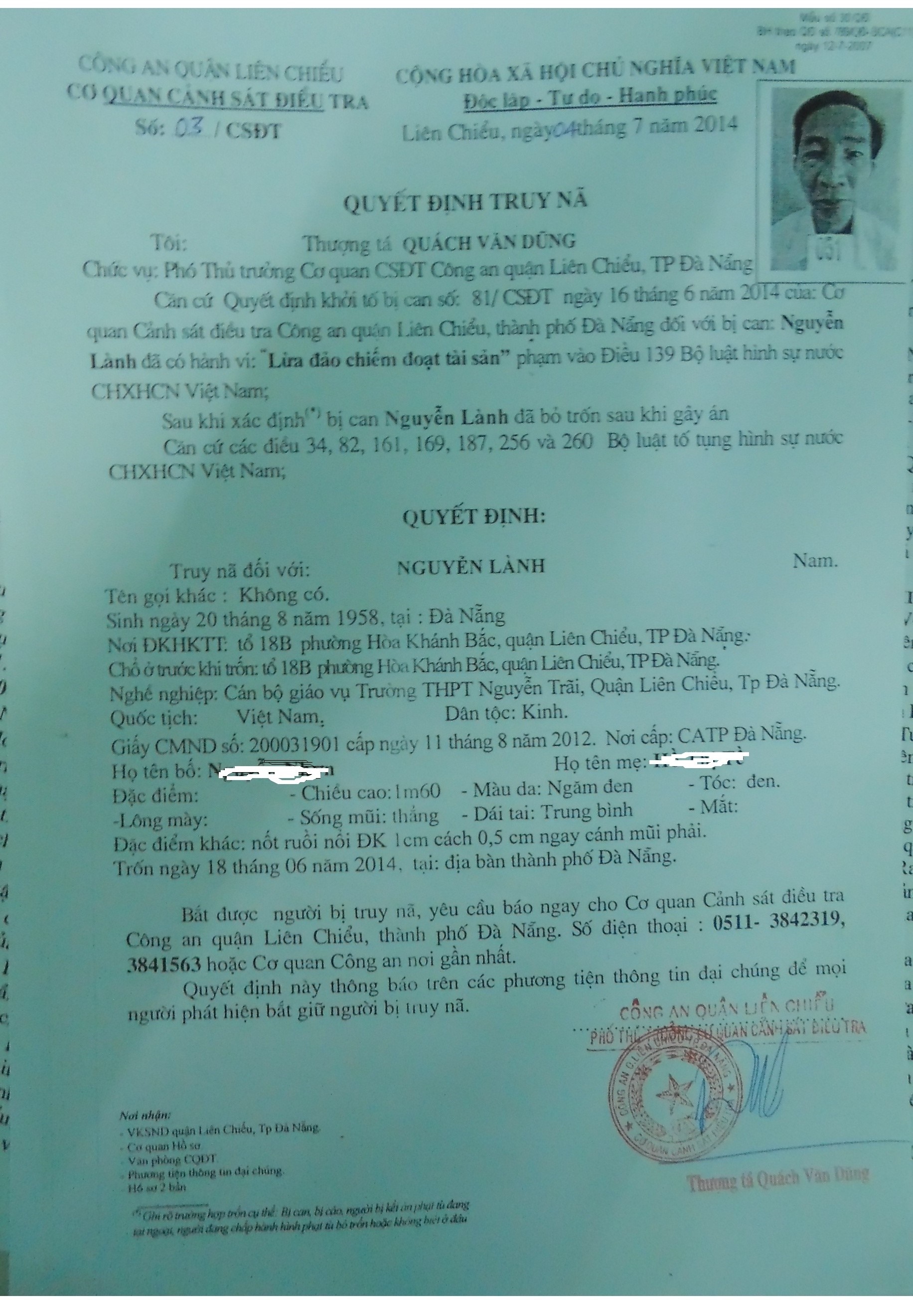 Qua thông tin đại chúng, Cơ quan CSĐT công an quận Liên Chiểu cũng thông báo bị can Nguyễn Lành đang lẩn trốn ở đâu hãy đến cơ quan công an nơi gần nhất đầu thú để được hưởng khoan hồng của pháp luật, còn nếu cố tình lẩn trốn hay người nào cố tình che dấu bị can sẽ bị xử lý theo pháp luật.
