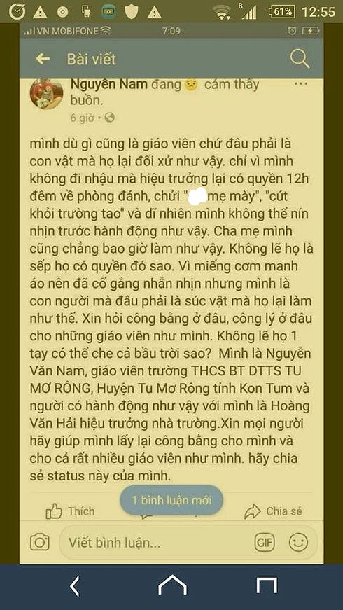 Dòng trạng thái của anh Nguyễn Văn Nam viết: "Mình dù gì cũng là giáo viên chứ đâu phải là con vật mà họ lại đối xử như vậy. Chỉ vì mình không đi nhậu mà hiệu trưởng lại có quyền 12h đêm về phòng đánh, chửi “...mẹ mày”, “cút khỏi trường tao”".