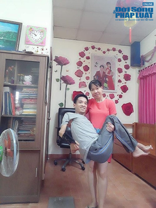 Mặc dù vất vả chăm sóc chồng bại liệt nhưng chị Minh Thơ luôn vui vẻ và trân trọng những gì mình đang có. |
