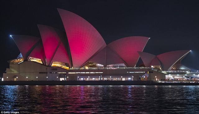Nhà hát Opera Sydney rực sáng trong ánh đỏ - màu tượng trưng cho hạnh phúc và thịnh vượng - để chào đón Tết nguyên đán. - Ảnh: Getty. |