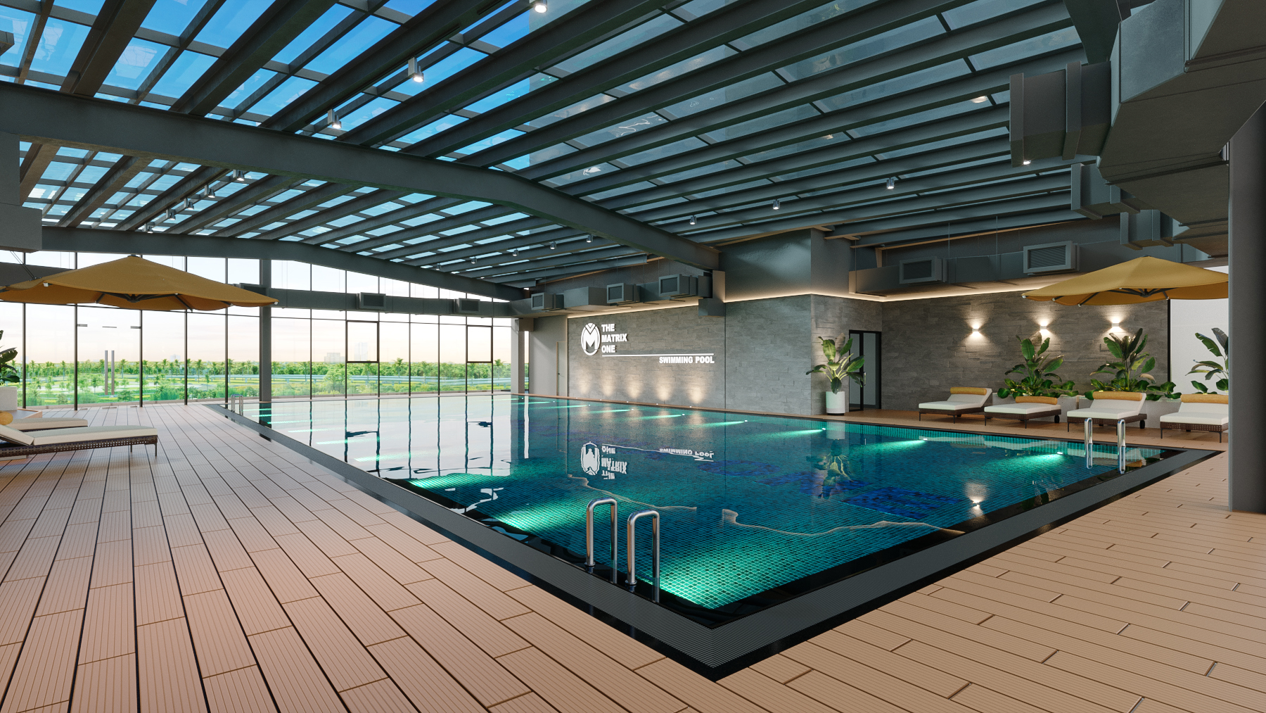 Tại The Matrix One, chủ đầu tư đã cho xây dựng một bể bơi 4 mùa được tại tầng 4, nằm ngay cầu nối giữa 2 tòa tháp với tầm nhìn tuyệt mỹ ra công viên hồ điều hòa |