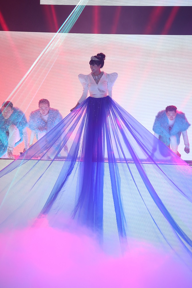 Là ca sĩ được chọn mở màn, lại có màn nhảy từ trên bục cao 2m xuống dưới khiến Pha Lê không khỏi lo lắng. |