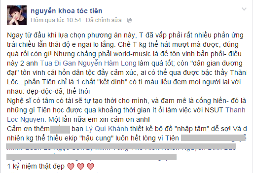 Tóc Tiên nhận xét phần trình diễn của cô và ê-kíp là "đẹp - độc - đã" và gọi đó là "một kỷ niệm đẹp".