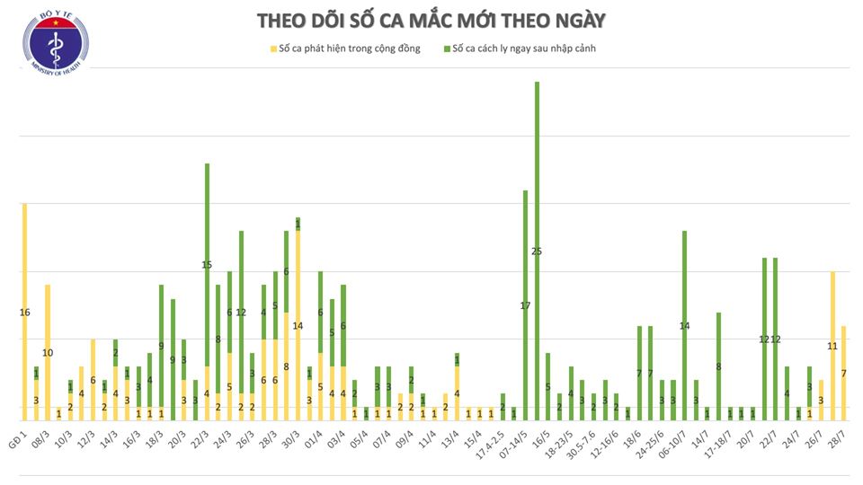 Bản tin lúc 18h ngày 28/7 của Ban Chỉ đạo Quốc gia Phòng chống dịch COVID-19 cho biết đã có thêm 7 ca bệnh dương tính với COVID-19 ở Đà Nẵng, Quảng Nam. Đến thời điểm này Việt Nam có 438 ca bệnh.
