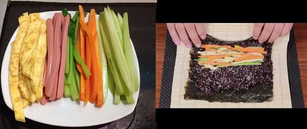 Cho cà rốt, dưa leo, trứng chiên cắt sợi lên phần cơm đã trải đều. Sau đó cuộn lại từ từ sao cho cuộn rong biển tròn và chặt để khi cắt thành khoanh nhỏ cuộn cơm không bị vỡ.