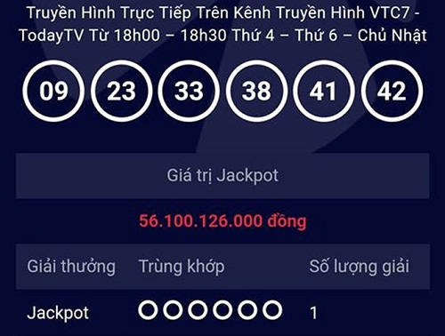 Giá trị giải thưởng lần này là 56,1 tỷ đồng. Đây là lần thứ 4 có người trúng giải đặc biệt (Jackpot) của xổ số Mega 6/45 và chỉ cách 1 tuần sau khi có người trúng giải 71 tỷ đồng.