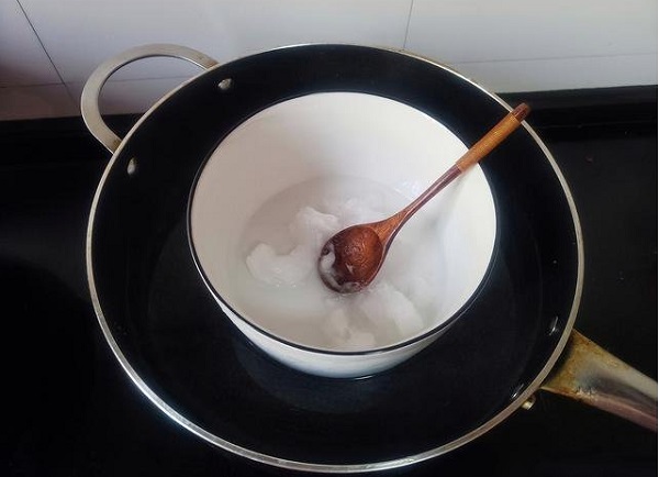 - Bước 1: Cho dầu dừa vào tô, đun cách thủy cho dầu dừa tan chảy hoàn toàn. Thêm đường vào bát dầu dừa trộn đều.