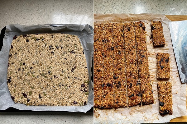 - Bước 3: Đổ yến mạch ra khay nướng đã lót giấy nến, dàn đều rồi nén chặt lại. Cho khay bánh vào lò nướng đã được làm nóng đến 180 độ C. Nướng bánh trong khoảng 30 phút hoặc cho đến khi bánh chín vàng là được.