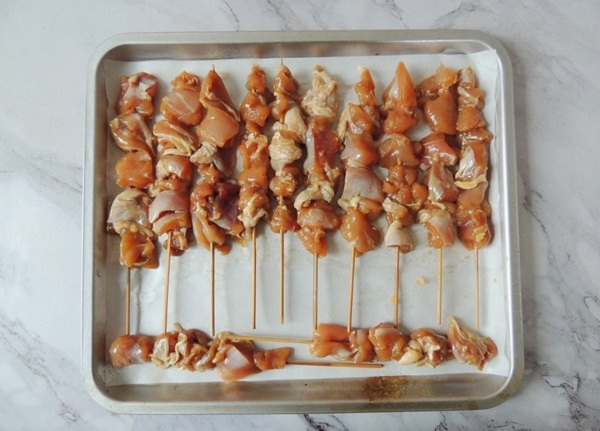 - Bước 5: Quét sốt ướp lên trên xiên thịt gà. Đặt khay thịt gà xiên vào lò nướng đã được làm nóng đến 190 độ C, nướng khoảng 10 phút sau đó lấy khay thịt gà ra rồi lật mặt, quét xốt ướp lên trên, nướng thêm khoảng 5 phút nữa là thịt chín.
