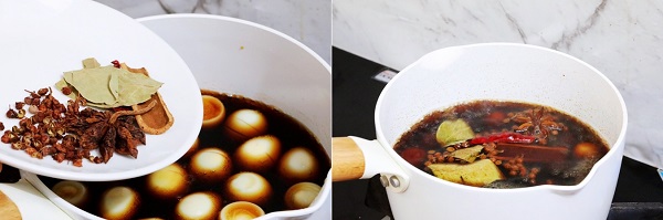 - Bước 2: Cho trứng cút vào nồi, thêm coca, nước tương, muối, hạt tiêu Tứ Xuyên, lá nguyệt quế, quế, hoa hồi vào. Đậy nắp nồi, đun sôi rồi để lửa vừa, đun trong khoảng 15 phút là được.