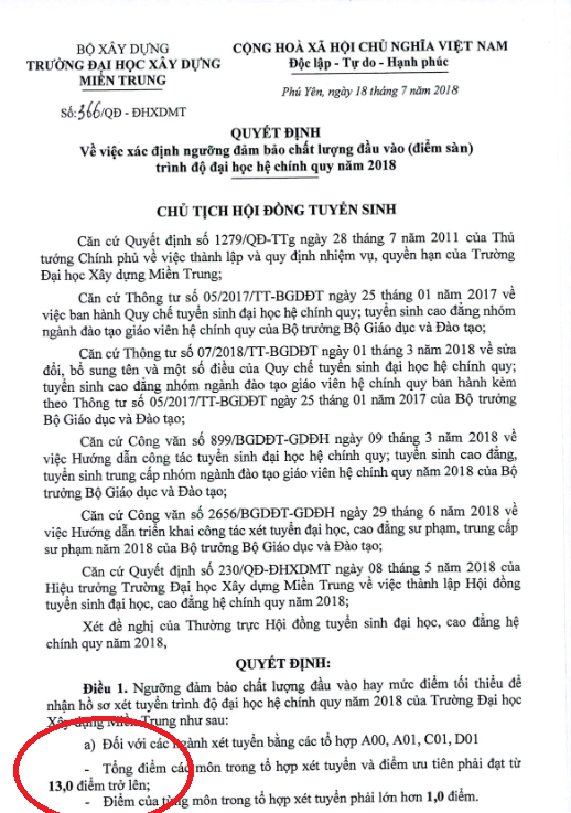 Cụ thể, trên trang web của Trường Đại học Xây dựng miền Trung hôm 18/7 đã có văn bản thông báo việc điều chỉnh ngưỡng điểm tối thiểu nhận hồ sơ lên 13 điểm cho tất cả các tổ hợp. Trước đó, ngày 14/7, mức sàn xét tuyển do chính trường này công bố chỉ 11 điểm.