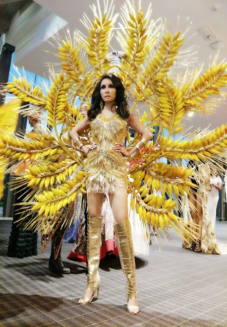 Bộ trang phục dân tộc nặng hơn 20kg được lấy cảm hứng từ cây lúa nước mang tên “The Golden Seeds – Những hạt ngọc vàng” cũng lọt top 3 trang phục dân tộc đẹp nhất Mrs Universe 2017.