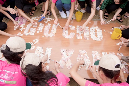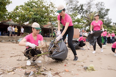 Các thí sinh Hoa hậu Việt Nam 2018 bắt tay vào dọn rác trên bờ biển. |