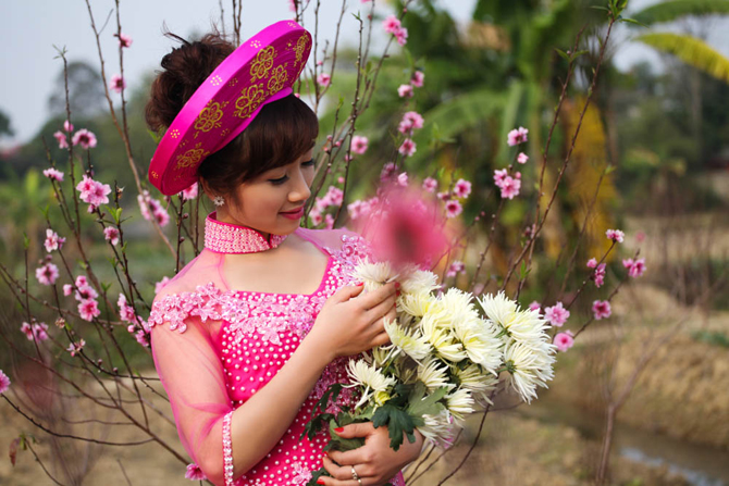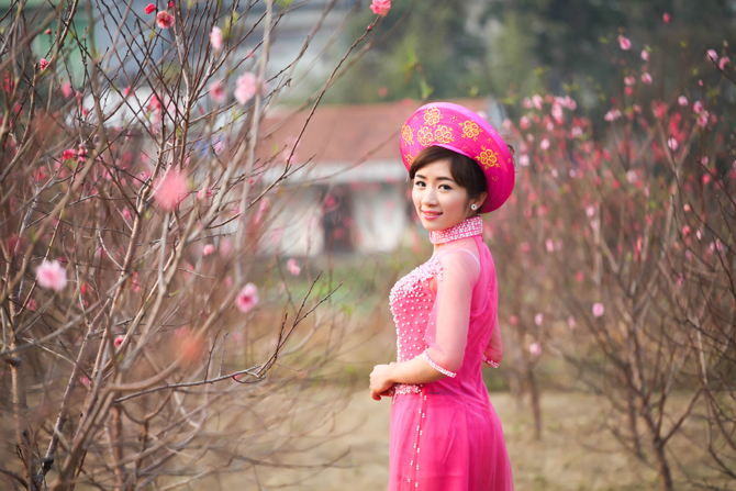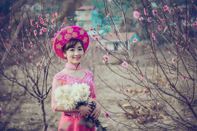 Vài ngày qua, trên trang cá nhân của cô bạn có nickname Bọ Nẹt có chia sẻ những bức ảnh mặc áo dài khoe sắc bên những cây đào.