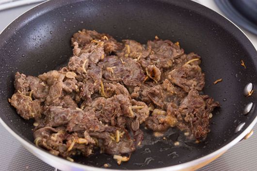 – Sau khi rau củ gần chín các bạn đổ thịt bò vào xào cùng, để lửa to, đảo đều rồi tắt bếp.