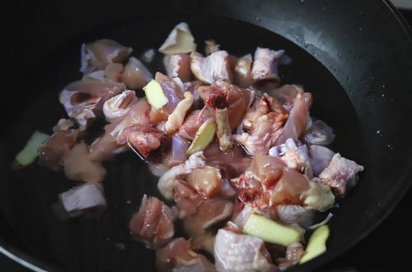 - Thịt đùi gà rửa sạch chặt miếng vừa ăn. Cho thịt gà vào nồi nước cùng vài lát gừng và rượu nấu ăn. Luộc qua rồi vớt ra rửa sạch lại, để ráo.