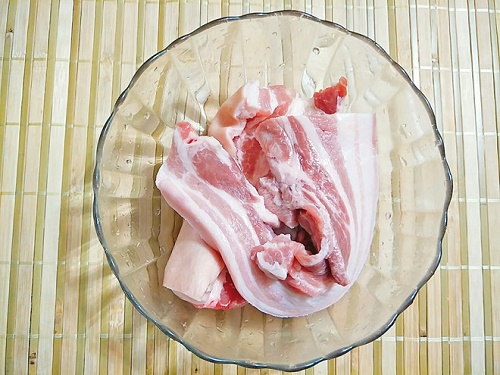 - Bước 2: Với thịt ba chỉ, bạn cắt thành miếng nhỏ.