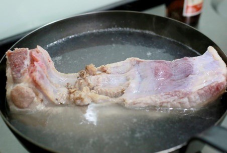 Đun sôi một ít nước trong nồi cho xíu baking soda vào dùng đũa khuấy đều để baking soda tan. Lúc này, cho phần bì lợn chìm xuống phẩn nước, đun khoảng 5 phút, khi hết thời gian thì nhanh chóng cho thịt. Dùng dao sắc cạo sạch phần lông lợn vì lông đã mềm hơn, việc cạo rất dễ dàng.