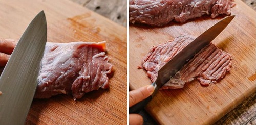 + Thịt lợn rửa sạch, rồi thấm khô bằng khăn giấy. Cắt thịt lợn thành các miếng to bản nhưng dày khoảng 5cm theo góc 30 độ.