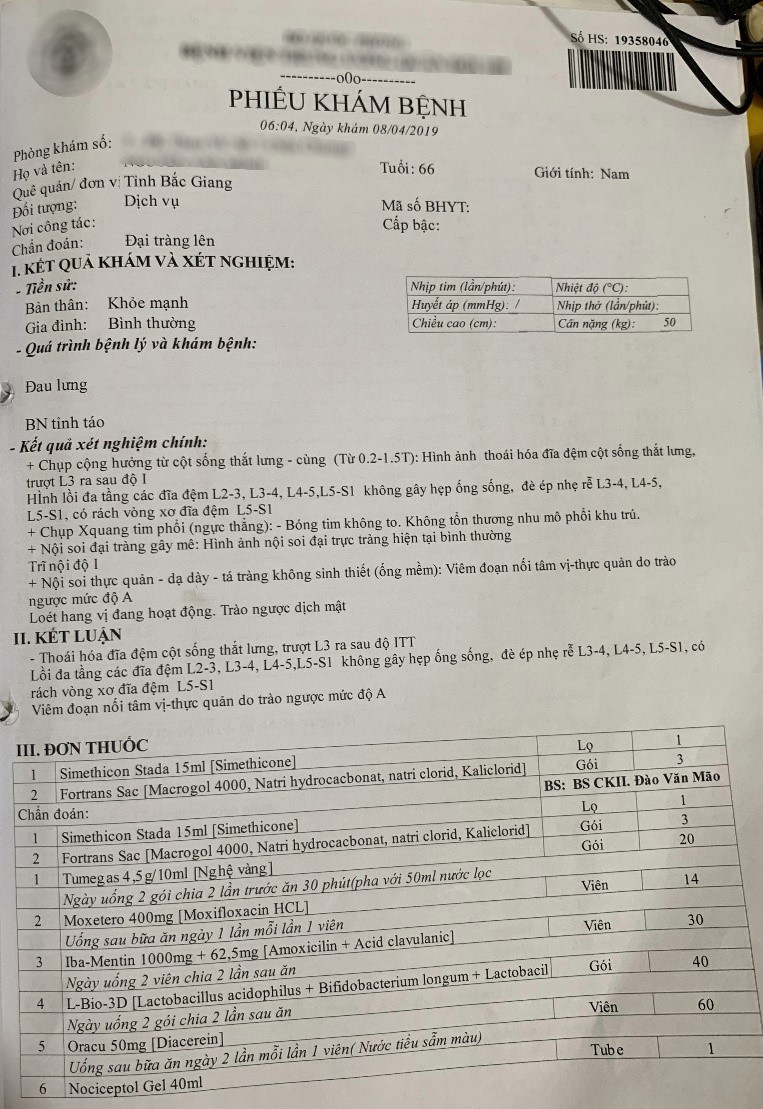 Sau khi thăm khám, ngoài việc xác định được nguyên nhân chính xác gây ra tình trạng đau lưng của ông, bác sĩ còn cho biết ông đang bị loét hang vị dạ dày, nên cần phải điều trị bệnh này trước vì các thuốc điều trị bệnh đau lưng có thể sẽ làm nặng thêm tình trạng bệnh viêm loét hang vị dạ dày của ông. Cầm đơn thuốc điều trị dạ dày về mà lòng ông cảm thấy nặng trĩu. Có thể do trước đây ông dùng nhiều loại thuốc nên bị loét hang vị dạ dày. Ông lo lắng khi nghĩ đến những ngày tháng tiếp theo phải sống chung với những cơn đau do thoái hóa đĩa đệm cột sống thắt lưng gây ra.