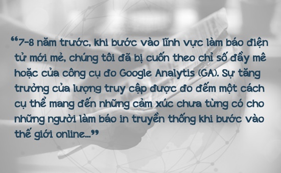 Trong một bài trả lời phỏng vấn đăng trên số tết báo Công luận hồi đầu năm 2019 , tôi có thú nhận: “7-8 năm trước, khi bước vào lĩnh vực làm báo điện tử mới mẻ, chúng tôi đã bị cuốn theo chỉ số đầy mê hoặc của công cụ đo Google Analytis(GA).Sự tăng trưởng của lượng truy cập được đo đếm một cách cụ thể mang đến những cảm xúc chưa từng có cho những người làm báo in truyền thống khi bước vào thế giới online. Hệ lụy là phóng viên say mê với thủ thuật để tăng view mà xa rời những kỹ năng cơ bản và quan trọng nhất của người làm báo-viết,quay, chụp, biên tập,tác nghiệp lấy thông tin hiện trường, phỏng vấn hay tường thuật”.