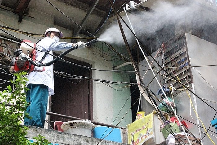 Phun hóa chất diệt muỗi phòng SXH tại một khu nhà trọ ở Hà Nội - Ảnh: An ninh thủ đô. |