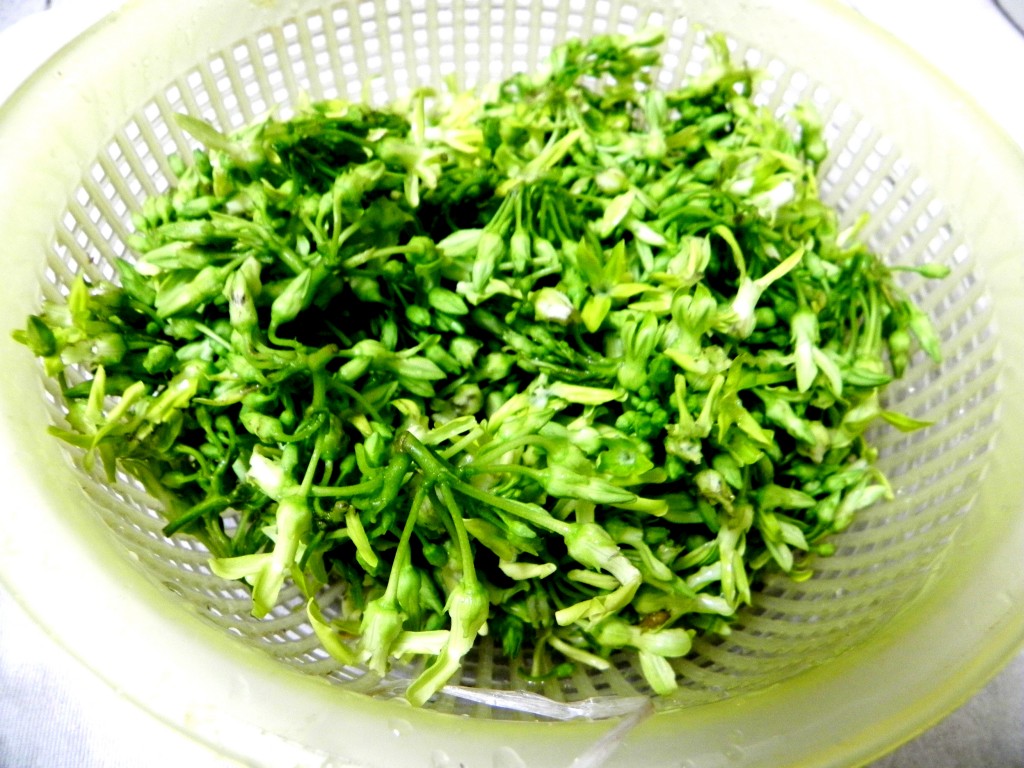 Bước 3: Hoa thiên lý các mẹ nên chọn những bông hoa còn đang "chúm chím" nở, những bông hoa này ăn sẽ rất thơm ngọt và khi xào sẽ không bị nát. Hoa thiên lý nhặt và rửa sạch, để ráo