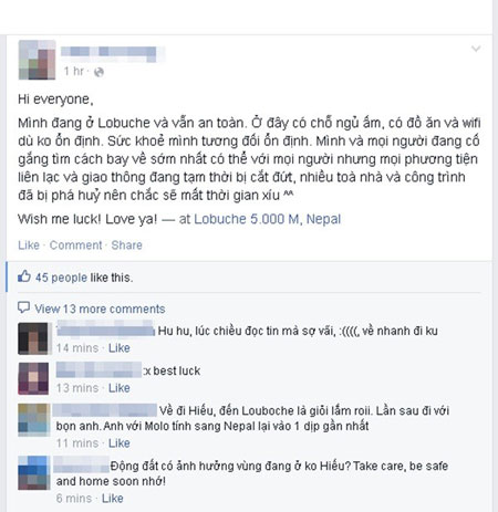 Thông tin từ báo Tri thức trẻ, anh Hà Trung Hiếu - một người may mắn sống sót sau vụ động đất chia sẻ, anh hiện đang ở Lobuche và vẫn an toàn, đồng thời mang đến cho mọi người những thông tin mới nhất về tình hình cứu nạn của các nạn nhân vụ động đất tại Nepal: "Mình đang ở Lobuche và vẫn an toàn. Ở đây có chỗ ngủ ấm, có đồ ăn và wifi dù ko ổn định. Sức khoẻ mình tương đối ổn định. Mình và mọi người đang cố gắng tìm cách bay về sớm nhất có thể với mọi người nhưng mọi phương tiện liên lạc và giao thông đang tạm thời bị cắt đứt, nhiều toà nhà và công trình đã bị phá hủy nên chắc sẽ mất thời gian xíu". Bên cạnh đó, anh Hiếu cũng chia sẻ những thông tin cá nhân để mọi người có thể liên lạc trong trường hợp nguy cấp.