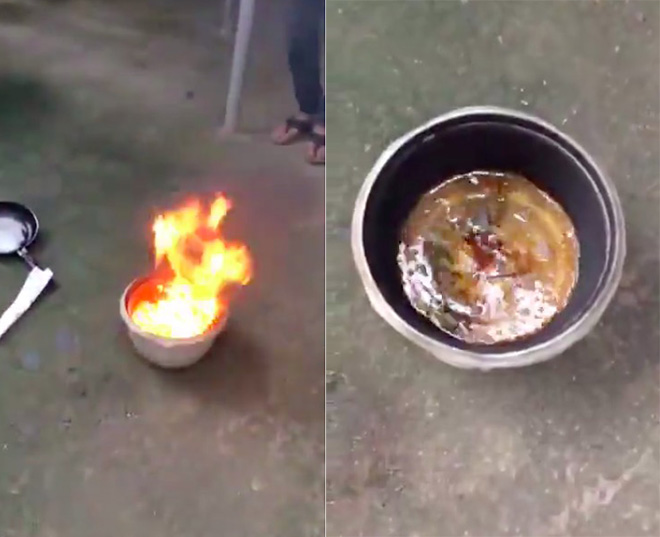 Nước giếng bốc cháy ngùn ngụt khi châm lửa, sau đó còn đọng lại một lớp nước màu đục - Ảnh: báo Dân Việt |