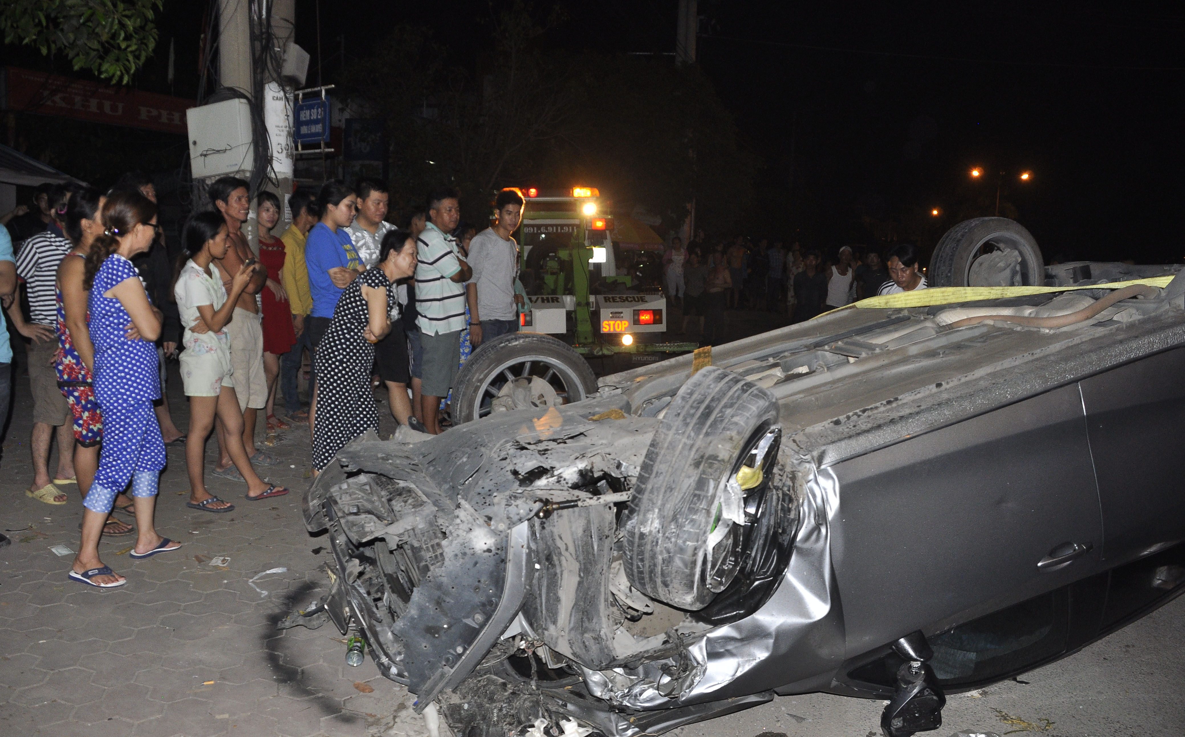 Tại hiện trường, chiếc xe ô tô bị lật ngửa, hư hỏng nặng chắn giữa đường.