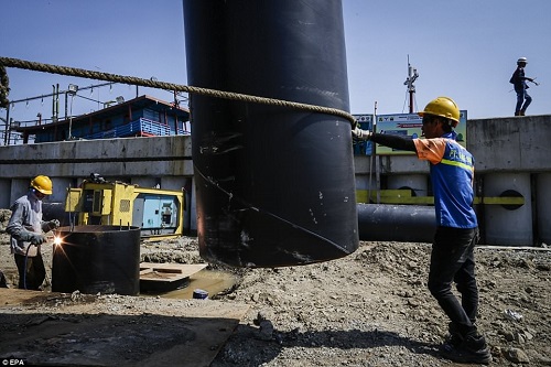 Một bức tường biển đang được xây dựng. Ảnh: EPA |