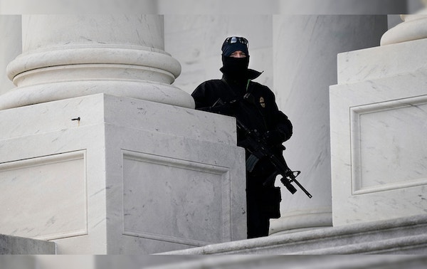 Rào chắn chống bạo động của được dựng lên quanh khu vực toà nhà Quốc hội trên đồi Capitol và gần khu vực Nhà Trắng. Các sĩ quan cảnh sát, vệ binh được bố trí dày đặc tại thủ đô Washington D.C cho thấy bầu không khí căng thẳng khác lạ trong lễ nhậm chức năm nay. |