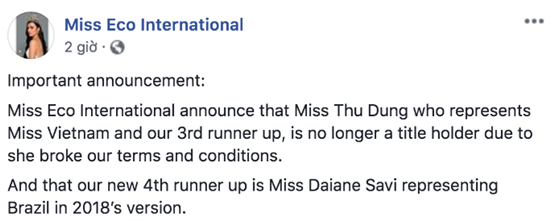 Theo thông tin mới cập nhật từ fanpage chính thức của cuộc thi Miss Eco International (Hoa hậu sinh thái Quốc tế), Thư Dung đã bị thu hồi danh hiệu Á hậu 2 với lý do cô đã vi phạm một số điều khoản của cuộc thi Miss Eco International 2018.