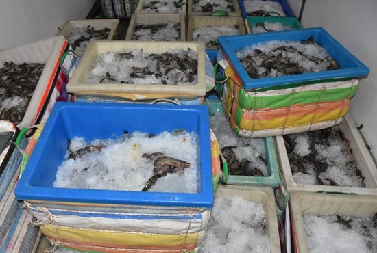 Sau khi ra hiệu lệnh dừng phương tiện để kiểm tra thì phát hiện trên xe đang vận chuyển 21 thùng xốp chứa tôm nguyên liệu.