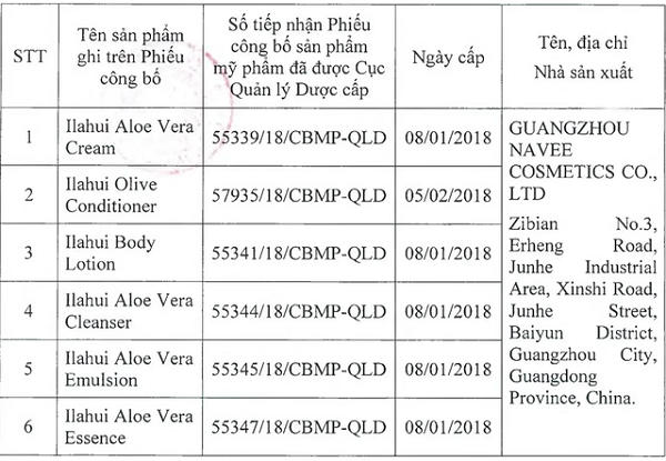 Cụ thể, tại công văn số 20914/QLD-MP, Cục Quản lý dược thông báo đình chỉ lưu hành, thu hồi trên toàn quốc 6 sản phẩm mỹ phẩm, gồm: Ilahui Aloe Vera Cream, Ilahui Olive Conditioner, Ilahui Body Lotion, Ilahui Aloe Vera Cleanser, Ilahui Aloe VeraEmulsion, Ilahui Aloe Vera Essence (đều do công ty GuangZhou Navee Cosmetics Co.Ltd – Trung Quốc sản xuất).