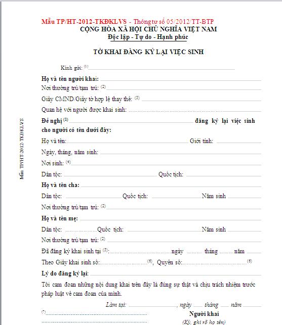 - Tờ khai đăng ký lại việc sinh (Mẫu TP/HT-2012-TKĐKLVS).