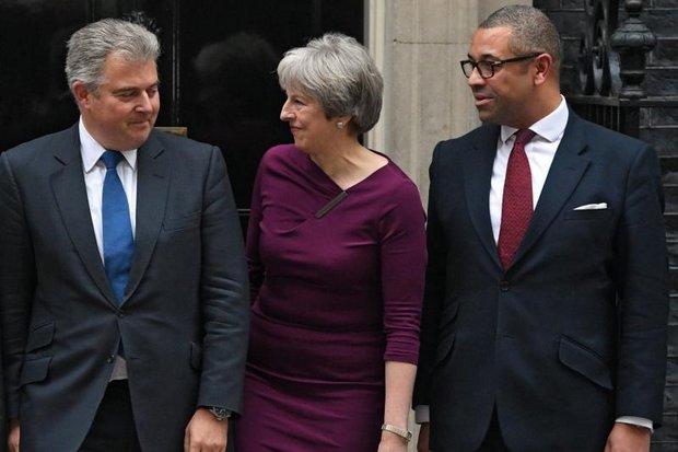 | Thủ tướng Anh Theresa May (giữa) và Chủ tịch Đảng Bảo thủ Brandon Lewis (trái), phó Chủ tịch Đảng Bảo thủ James Cleverly - Ảnh EPA. |