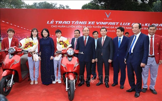 | Thủ tướng Nguyễn Xuân Phúc và các đại biểu chứng kiến Lễ trao thưởng của Tập đoàn Vingroup tặng 1 ô tô VinFast Lux A cho HLV trưởng Đội tuyển bóng đá nữ Mai Đức Chung và tặng xe máy VinFast Klara S cho các cầu thủ Đội tuyển bóng đá nữ. Ảnh: Thống Nhất/TTXVN |