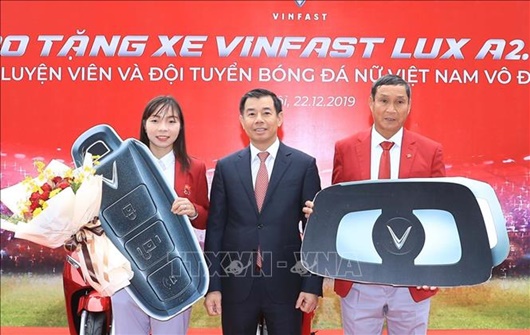 | Tập đoàn Vingroup tặng 1 ô tô VinFast Lux A cho HLV trưởng Đội tuyển bóng đá nữ Mai Đức Chung và 1 xe máy VinFast Klara S cho mỗi cầu thủ đội tuyển bóng đá nữ. Ảnh: Thống Nhất/TTXVN |
