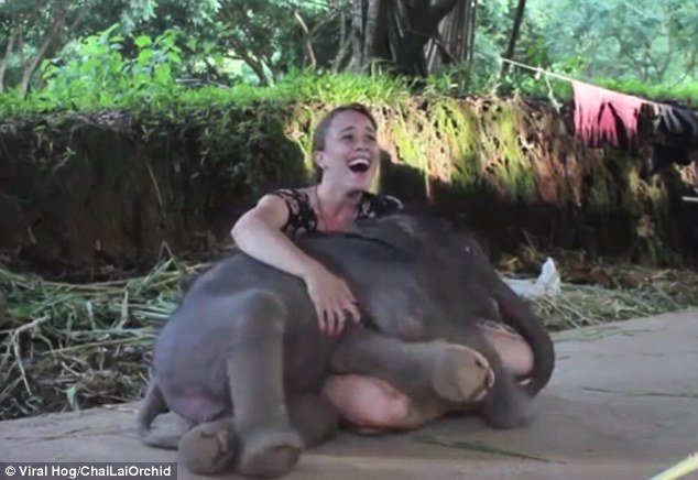 Khi thấy cô nhân viên cười to, chú voi này càng ngả người thoải mái lên đùi cô và dụi vào người cô để thể hiện tình cảm và sự biết ơn của mình.