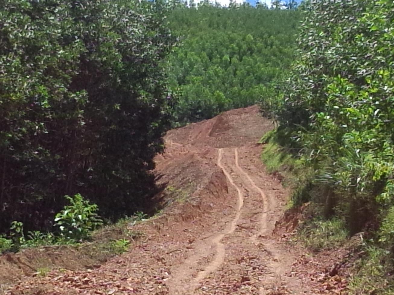 Một trong những đoạn đường mòn đất đỏ, ngoằn nghèo, đồi dốc hướng vào bãi đổ thải đất đá của Công ty Trường Thịnh. |