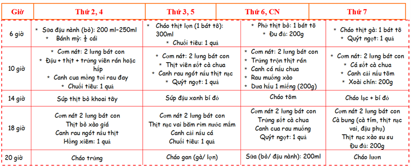 • Mẹ có thể tăng giảm khoảng cách giữa các giờ ăn trong thực đơn ở trên cho phù hợp với thói quen sinh hoạt của trẻ. Tuy nhiên, khoáng cách giữa các bữa phụ và bữa chính phải đảm bảo cách nhau ít nhất từ 2 đến 3 giờ.