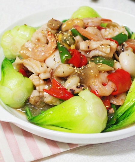 Cuối cùng, bạn chỉ cần sắp xếp cải thìa xung quanh đĩa và cho hải sản vào giữa trang trí cho món ăn thật đẹp, rắc thêm hạt vừng lên trên. Trông đĩa xào thật bắt mắt với nhiều màu sắc hòa trộn vào nhau thật hấp dẫn.