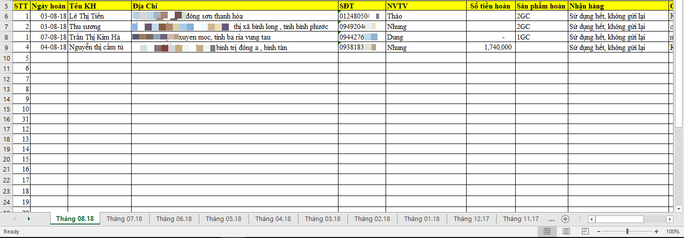 Danh sách khách hàng đã được hoàn tiền và sản phẩm T8 |
