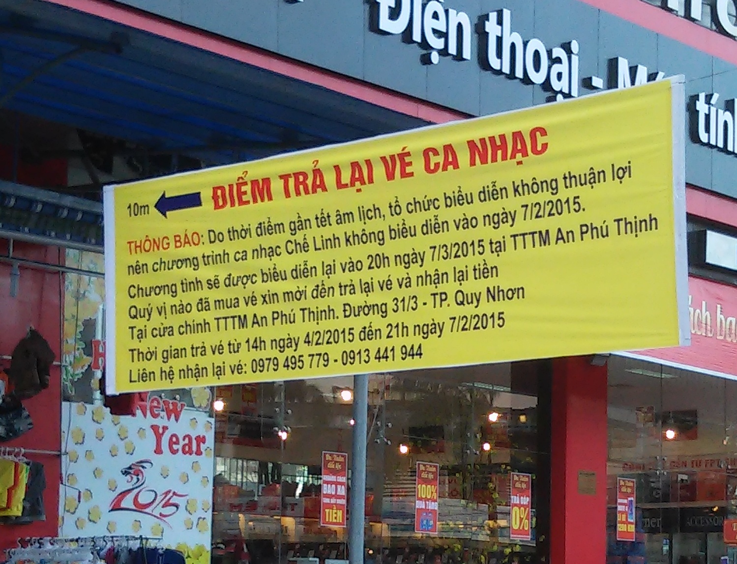 Một số tờ báo đã phỏng vấn qua điện thoại với ông Trương Đông Hải, Phó giám đốc Sở Văn hóa -Thể thao và Du lịch tỉnh Bình Định và trích dẫn lời ông Hải cho rằng, chương trình ca nhạc Chế Linh dự kiến diễn ra vào tối ngày 7/2/2015 tại TTTM An Phú Thịnh - TP Quy Nhơn bị đình chỉ. Nguyên nhân do địa điểm tổ chức chương trình không đảm bảo an toàn. Cụ thể, tầng 8 của An Phú Thịnh Plaza - nơi đăng ký chương trình ca nhạc Chế Linh chỉ có sức chứa khoảng 600 người nhưng ban tổ chức đã phát hành 1.000 vé. Ngoài ra, các điều kiện thoát hiểm tại địa điểm tổ chức không bảo đảm”.