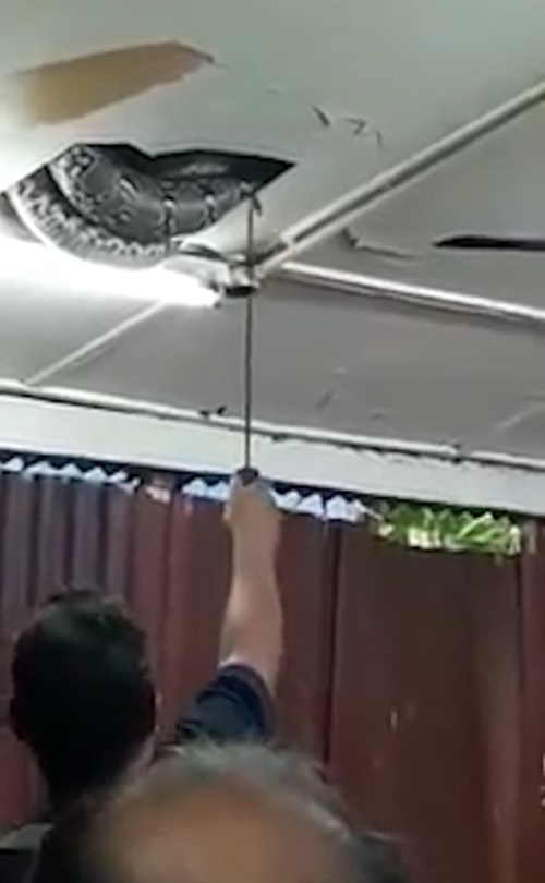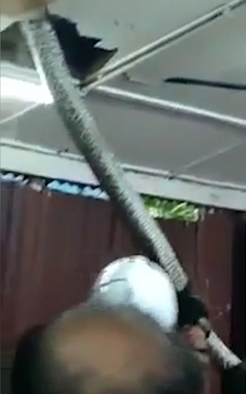 Video clip cho thấy các thực khách ngồi bên dưới, sợ hãi nhìn một đội ngũ các chuyên gia động vật hoang dã vào nhà hàng để chế ngự con rắn bằng một cái móc kim loại.