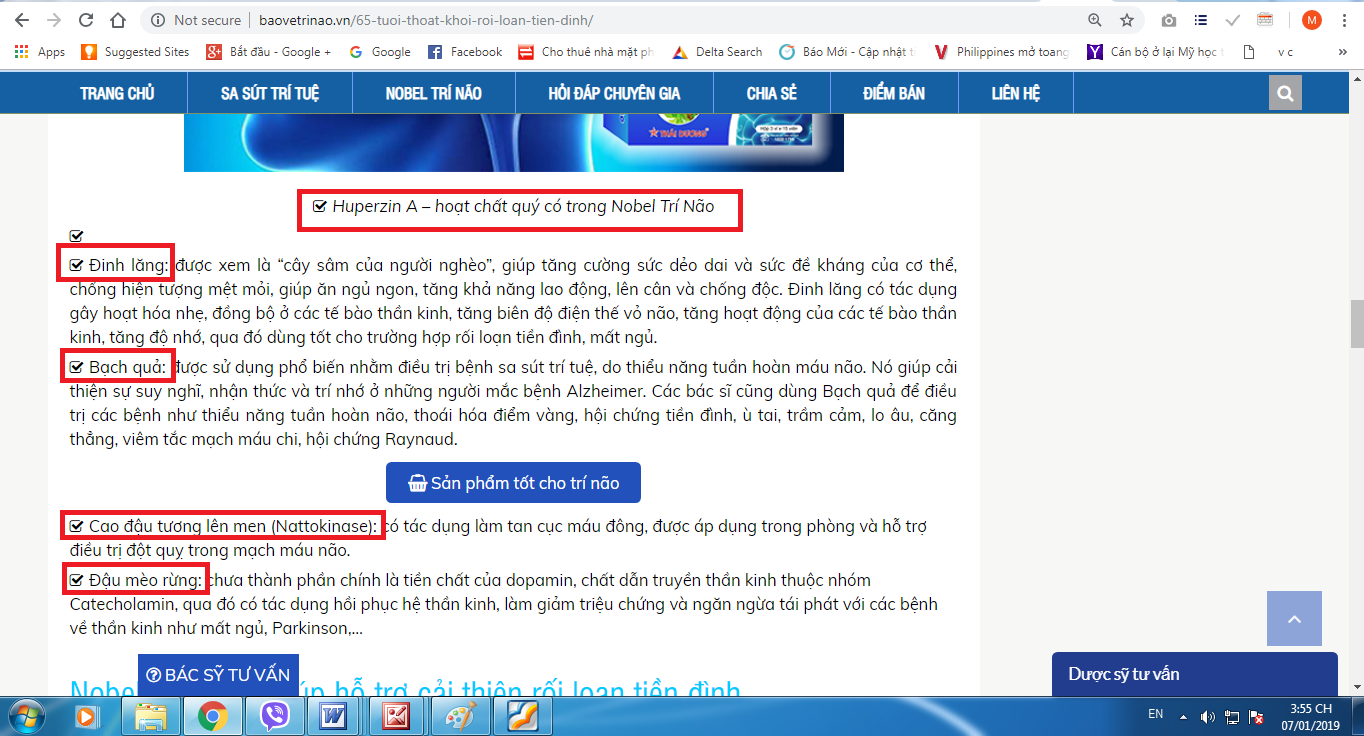 Trên trang web http://baovetrinao.vn, sản phẩm thực phẩm BVSK Nobel Trí Não được quảng cáo công dụng là: Giúp cải thiện tình trạng đau đầu, chóng mặt, rối loạn tiền đình, mất ngủ, suy giảm trí nhớ.