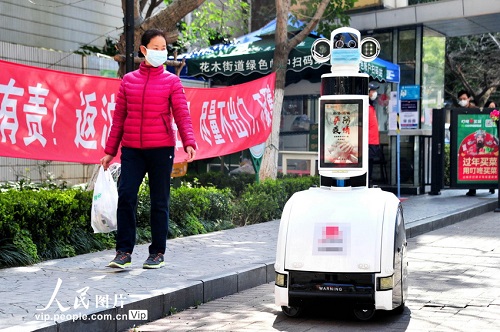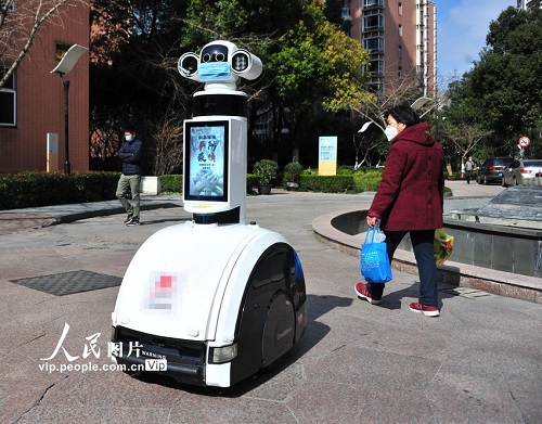 Vào ngày 27/2, trên khu phố Liên Dương Hoa Viên ở Thượng Hải (Trung Quốc) đã bất ngờ xuất hiện một robot phòng chống dịch bệnh thông minh đi tuần trên đường. Ảnh: Nhật báo Nhân dân |