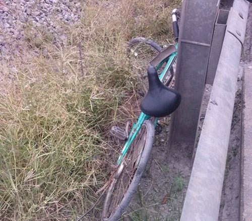 Chiếc xe đạp của cháu bé bị tàu đâm bẹp dúm. |