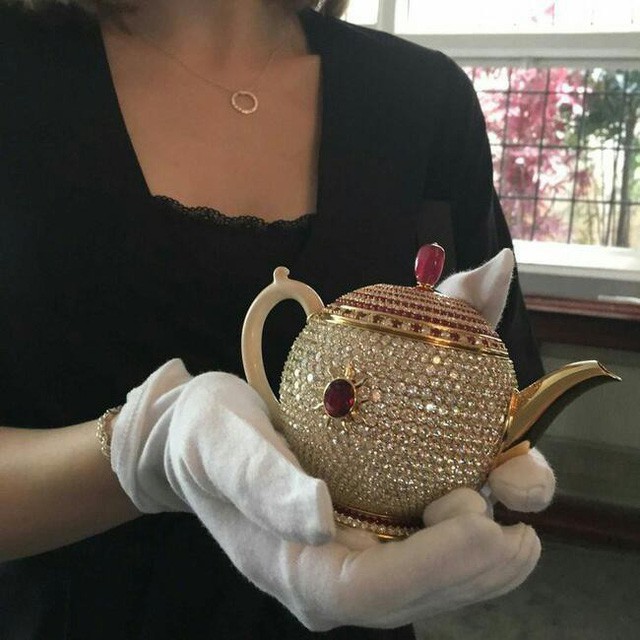 Chiếc ấm được trang trí bằng 1658 viên kim cương, kèm theo đó là 386 viên ruby có khối lượng 6.67 carat. |